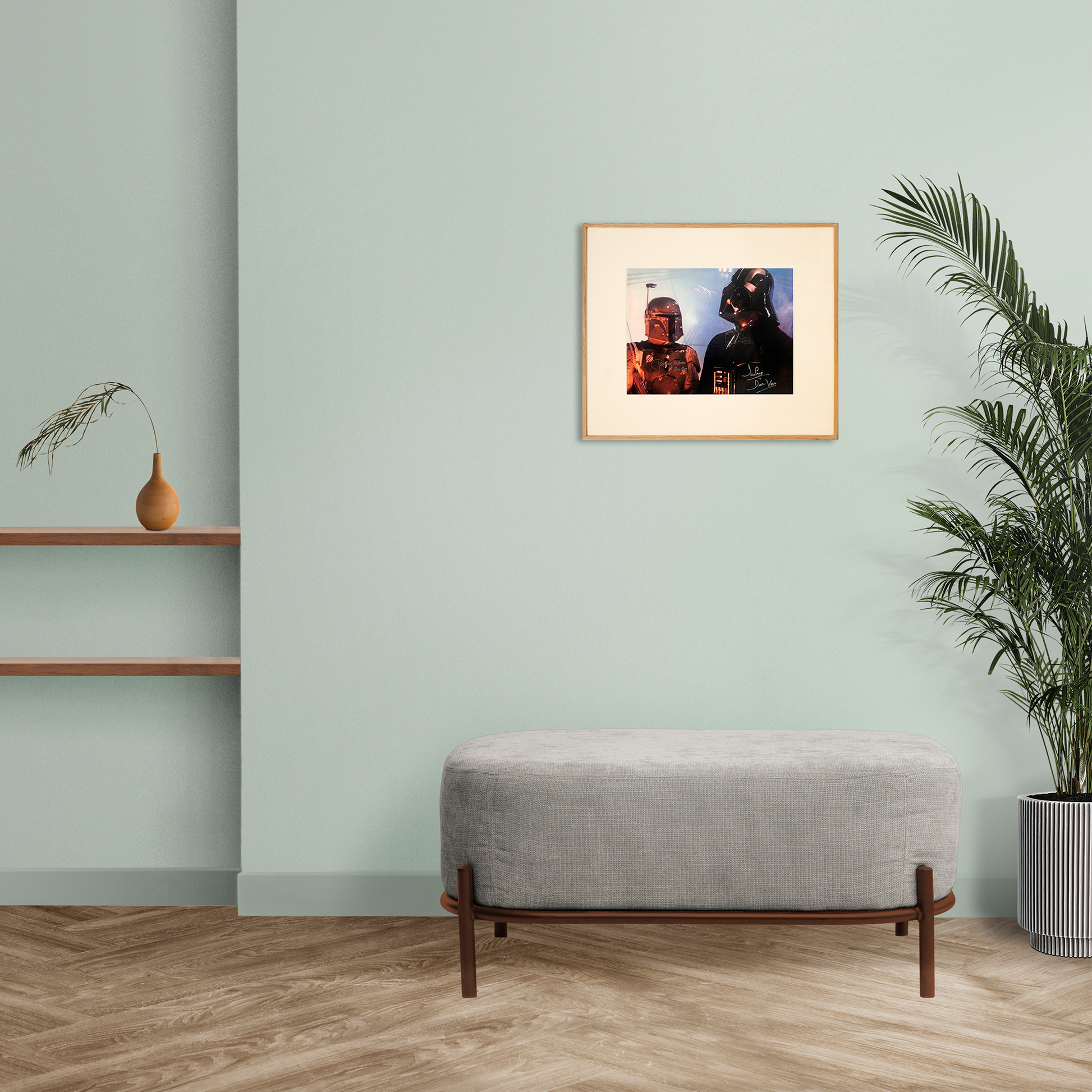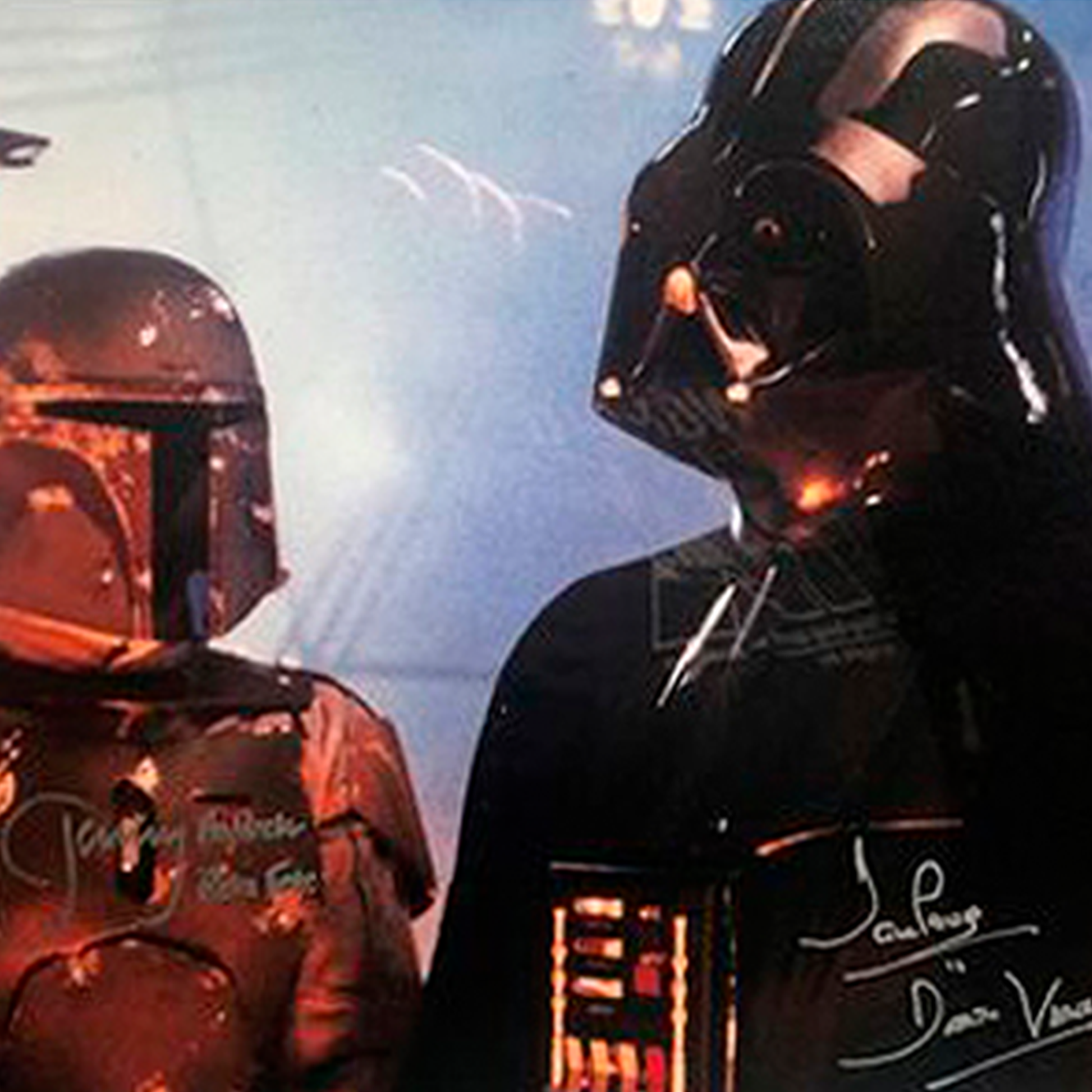 Foto de David Prowse y Bobba Fet en Star Wars: Episodio V - El Imperio Contraataca, 1980. Firmada por: David Prowse (Darth Vader) y Jeremy Bulloch (Bobba Fet). Impresión cromogénica sobre papel.