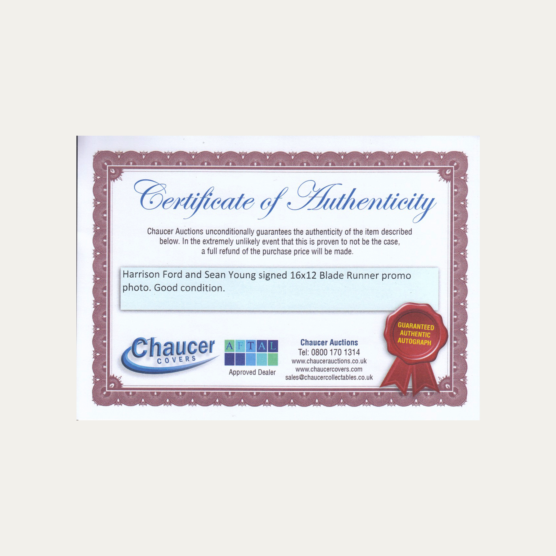 Lote 52: Póster firmado de Blade Runner (1982) - Harrison Ford, Sean Young