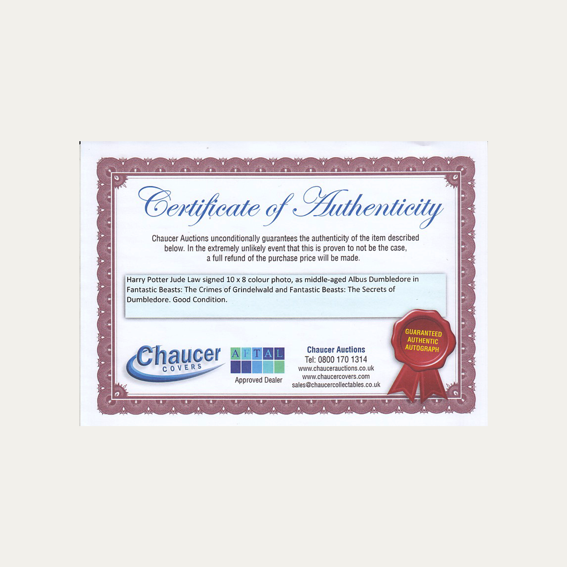 Lote 45: Fotografía firmada de Animales Fantásticos: Los Crímenes de Grindelwald (2018) - Jude Law