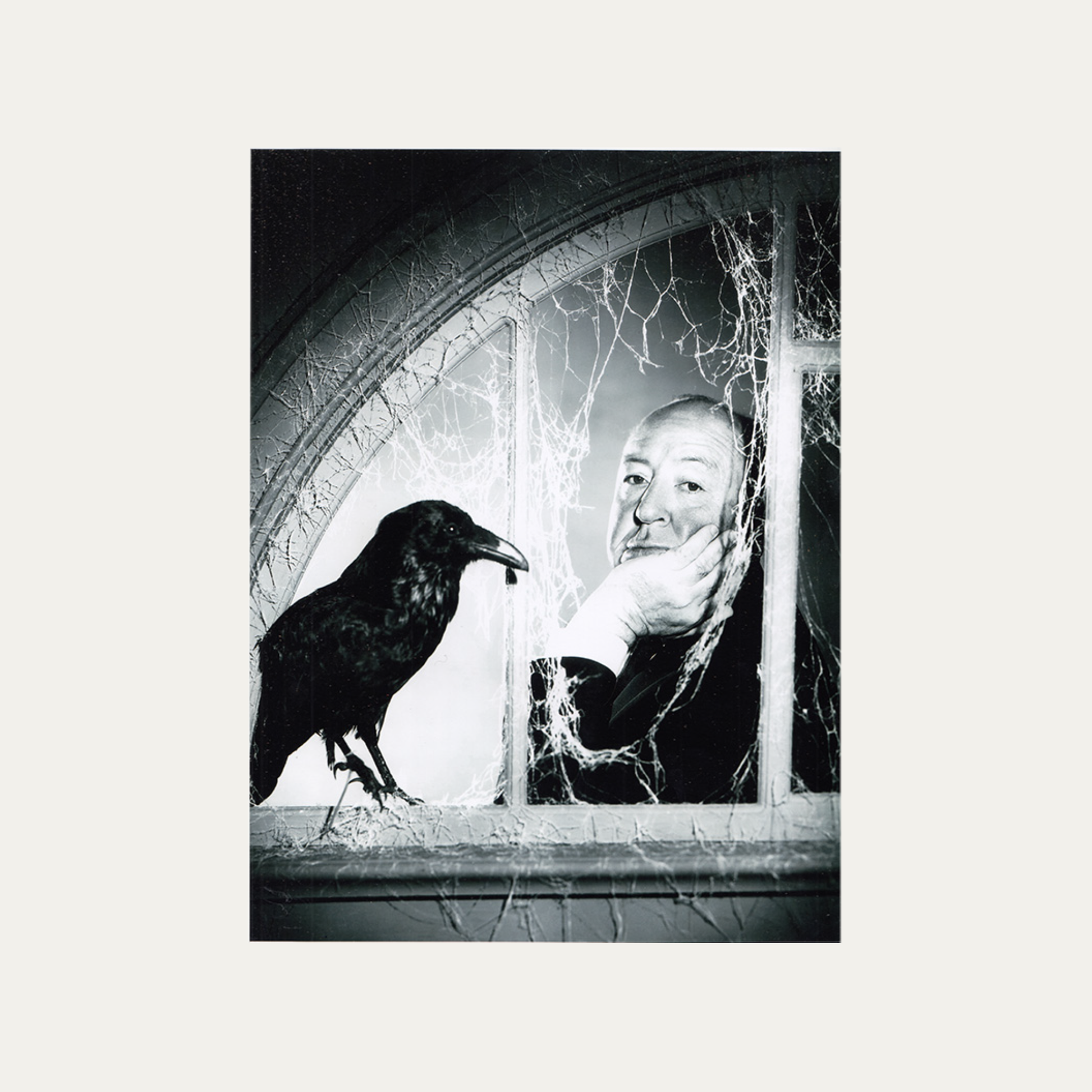 Photo of Alfred Hitchcock in The Birds of 1963. Signed by: no. Contemporary black and white print.