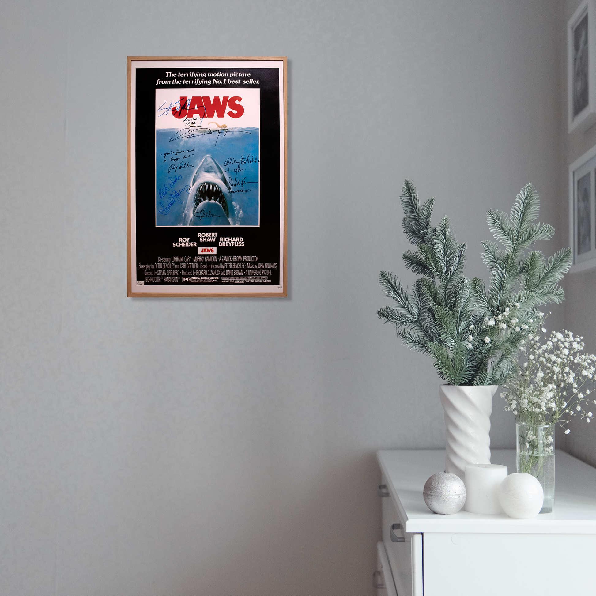 Poster of Roy Scheider, Richard Dreyfuss, Lorraine Gary, Susan Backlinie, Jeffrey Kramer, John Williams and Steven Spielberg in Jaws of 1975. Signed by: Roy Scheider, Richard Dreyfuss, Lorraine Gary, Susan Backlinie, Jeffrey Kramer, John Williams and Steven Spielberg. Digital printing on paper.